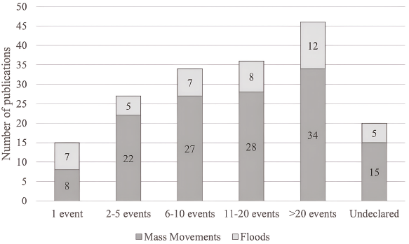 Figure 7 Number of events per publication related to the study of mass movements and flood hazards in mountain areas through the application of dendrochronology.