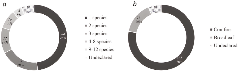 3 species, 9% used between 4 and 8 species, and 8% used between 9 and 12 species (Figure 8a). Regarding the species used in the studies, most (78%) used coniferous species in most of their sampling, while 16% used broadleaf species. Information regarding the species used was not provided in 6% of the works (Figure 8b).