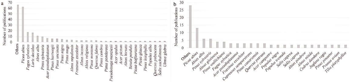 Figure 9 Tree species most used in studies associated with hazards from a) mass movements and b) floods caused by extraordinary rainfall events in mountain areas.