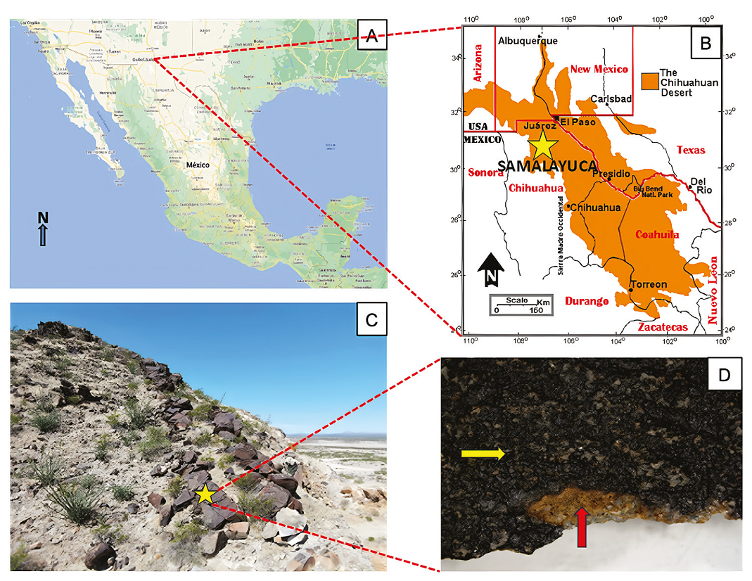 Figure 1 A and B. Location of the Chihuahuan Desert and Samalayuca collecting area (yellow star), Image taken and modified from Rivera-Rivera, 2006; C, Sampling site in Samalayuca. Prosopis glandulosa and Larrea tridentata are the dominant vegetation; D, Sample kind of collected varnish for this work. Dark varnish enriched with Mn-oxides (yellow arrow) and contact with underlying rock, sandstone (red arrow).
