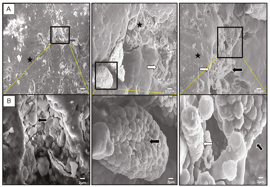 Figure 2 Analysis of varnish surface by SEM. A, Micrographs show many microorganisms morphologies embedded in the varnish such as: botryoidal biofilm (black star), ascomycetes colonies, hyphae and spores (black arrows), and tubular cells (white arrows). B, Magnification areas delimited by black rectangle (in A). Scale is indicated at bottom right by white bar (10 μm in A and 2 μm in B, respectively).
