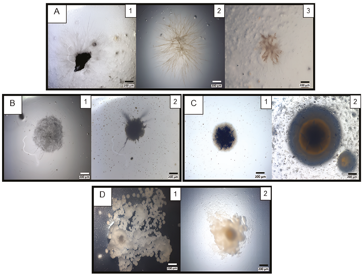 Figure 3 Strain colonial diversity recovered from pulverised varnish. A, Brown mucilage colonies with thin (A1-2) and astral mycelia (A3) morphologies. Micrographs (A1-3) correspond to AA Petri dishes incubated for 9, 10 or 8 days and, at 21º, 25º or 37ºC, respectively. B, Mycelium with sporangia morphologies. Micrographs (B1-2) correspond to AA Petri dishes incubated for 9 days at 21ºC. C, Rounded colonies. Micrographs correspond to CZ (C1), or TM (C2) Petri dishes incubated for 10 or 9 days and, at 25º or 21ºC, respectively. D, Umbonate colonies. Micrographs correspond to CZ Petri dishes incubated for 7 (D1) or 9 (D2) days and, 37º or 21ºC, respectively.