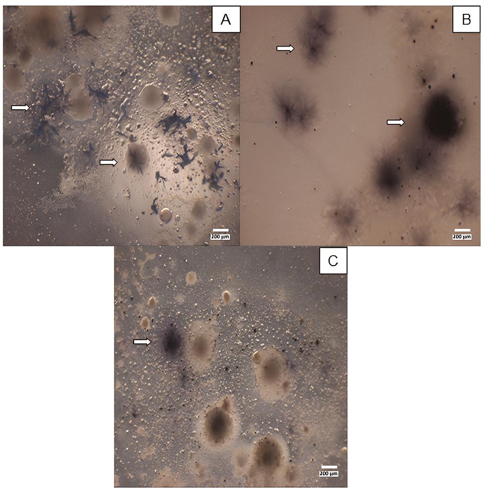 Figure 4 Revealing of oxidising microorganisms. A and B, AA medium culture incubation at 37ºC. C, TM medium culture incubation at 25ºC. All cultures were revealed in 22nd incubation day. Arrows highlight the positive presence of colonies with different morphologies.