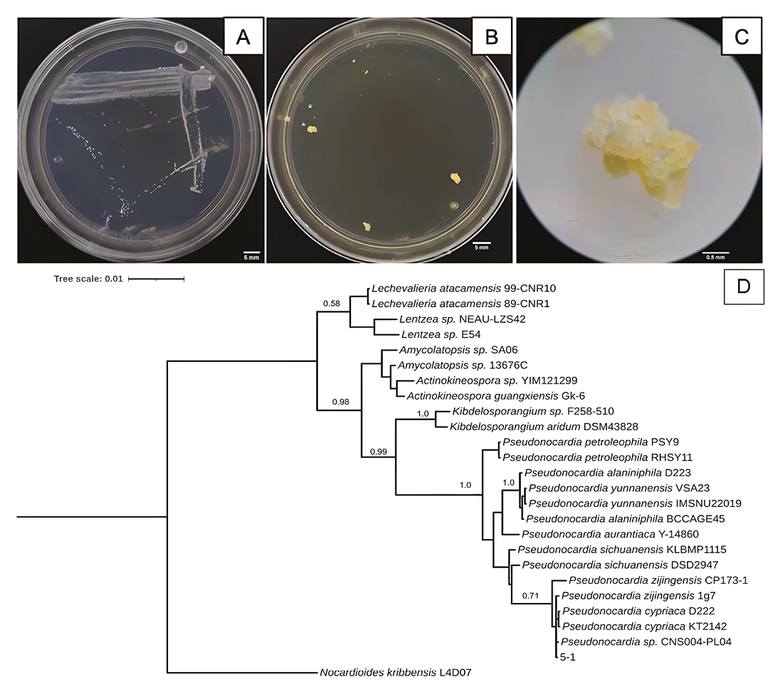 Figure 5 Characteristics of 5-1 isolated bacterium strain from Samalayuca desert varnish. A, Colony morphology in AA medium for seven days; B, or in NA medium for 14 days; both at 37°C. C, 5-1 colony micrograph in NA medium. D, Bayesian inference phylogenetic tree formed with rRNA 16S sequences. L4D07 Nocardioides kribbensis was the external group. The probability branch supports values are shown.