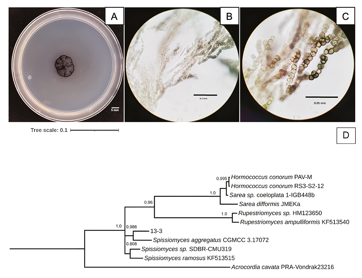 Figure 6 Characteristics of 13-3 isolated fungus strain from Samalayuca desert varnish. A, Colony morphology in PDA medium after 37 incubation days at 25°C; B and C, mycelium micrographs. D, Bayesian inference phylogenetic tree formed with ITS1 sequences. PRAVondrak23216 Acrocordia cavata was the external group. The probability branch supports values are shown.
