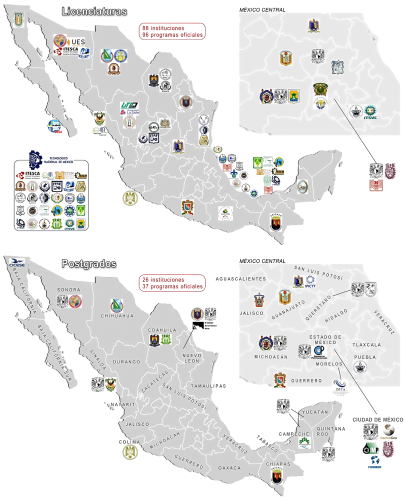 Figura 1. Instituciones de educación superior en México con programas docentes oficiales de licenciatura o postgrado en Ciencias de la Tierra, y su distribución geográfica por estado (parcialmente reelaborado de Villacorta et al., 2024).