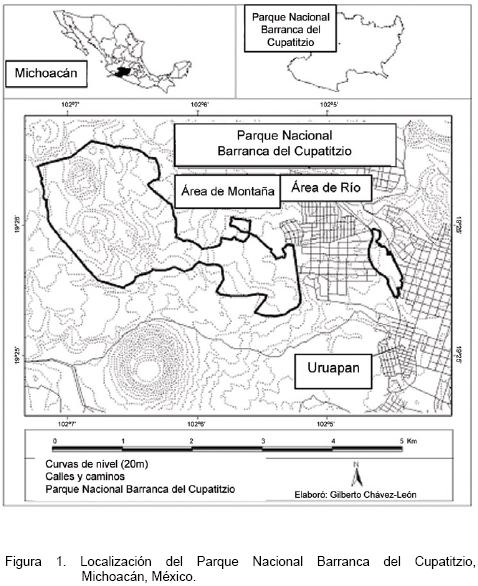 Localización y superficie. El Parque Nacional "Barranca del Cupatitzio" se localiza en la provincia fisiográfica del Eje Neovolcánico Transmexicano y en la subprovincia Neovolcánica Tarasca, al centrooccidente del estado de Michoacán, sus coordenadas geográficas son: 19° 25' 11" 19° 26' 24" N y 102° 07' 40" 102° 04' 20" W. Se ubica en el límite de los municipios de Uruapan y Nuevo Parangaricutiro, con una extensión de 458.21 ha (Figura 1) y conformado por dos polígonos separados un kilómetro entre sí. El más extenso, conocido como Área de Montaña, tiene una superficie de 438.55 ha, constituido por un cono y un domo volcánicos de pendiente suave, cañadas, zonas planas y derrames de lava (GómezTagle, 1985). El pequeño, llamado Área de Río con 19.66 ha, está inmerso en la zona urbana de Uruapan y su topografía es de barranca y zonas planas. En la parte baja del parque (1,640 msnm) se localiza la barranca donde nace el río Cupatitzio; los puntos de mayor altitud son el Cerro Chiquito (2,136 msnm) y la Loma Larga (2,057 msnm), ambos en el Área de Montaña.