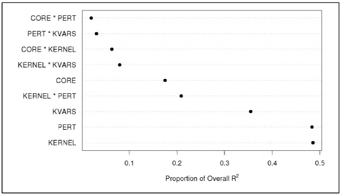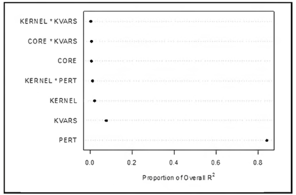 The regression model suggests with a 95% confidence that the proportion of the variability in computational time explained by these parameters is contained in the interval (22%, 35%). Figure 10 shows the proportion of R2 loss if the variable is removed. Omitting the percentage of initial allocation assignments during pre-processing or perturbation from the model results in the loss of about half of the explanatory power of computational time. Likewise, omitting the magnitude of the variance weight factor will drop the explanatory power of the model more than by 35%.
