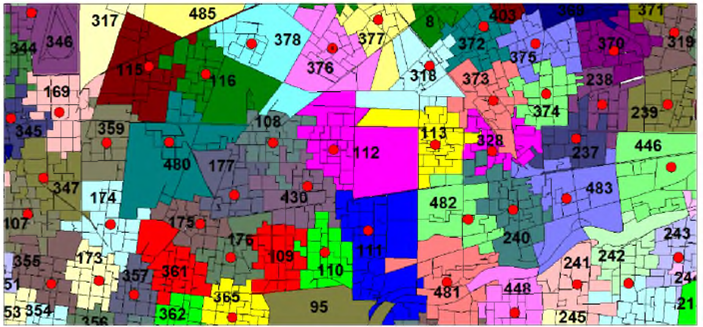 In addition to the computational test for heuristics, a method to understand a representation of the solution is determined as a requirement for business users before implementation. We used a GIS application in order to make a graphical representation of our territory design solution. This strategy was useful not only to demonstrate how the business rules are considered on the proposed solution, particularly, for risk balance constraints, but also to figure out any other potential operational difficulties during implementation. Figure 11 includes an example of a real-world solution implemented for the MFI. Because of size and complexity issues, we show a partial map of the entire territory design for presentation.
