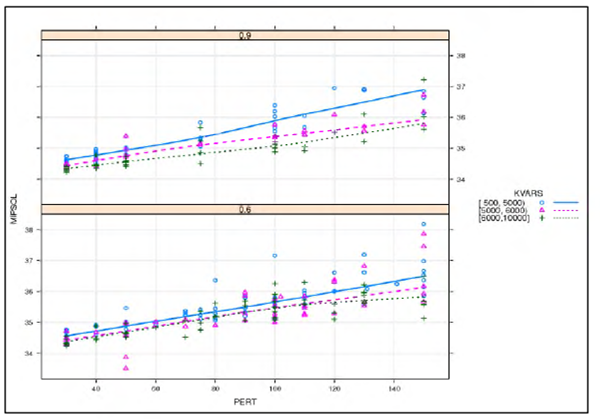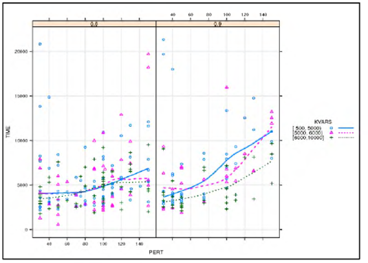 These bootstrap estimates support patterns observed in Figures 8 and 9 such as the curvilinear relationship between computational time and perturbation, and the changes in the relationships between the magnitude of the variance weight factor, perturbation, and time for different values of percentage of initial allocation assignments,