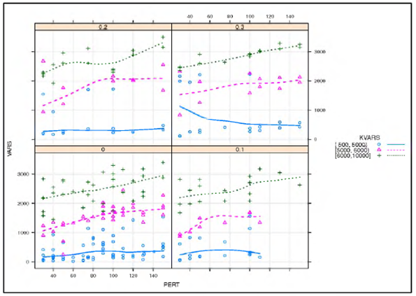 Graphical analyses to evaluate the effect of the hybrid heuristic parameters on the profitability variance among branches (VARS) are shown in Figures 5 and 6. Determining the percentage of initial allocation assignments during preprocessing as 0 results in a positive linear pattern for the profitability variance among branches and perturbation. Setting the percentage of the initial allocation assignments during pre-processing to 0.2 and 0.3 leads to curvilinear relationships between the heterogeneity of the profitability, profitability variance among branches, and perturbation (see Figure 5). There is also evidence implying that an increase in the variance weight factor is associated with an increase in profitability variance among branches (see Figure 6). Indeed, most of the variation in the resulting profitability variability can be explained by the magnitude of the variance weight factor.