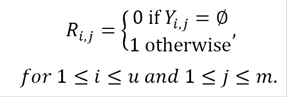Given a data matrix Y of size u x m, where u represents the number of articles that study some outcome or users that rank some phenomenon, and m represents the number of outcomes studied or features ranked, certain data e may be present and some other data t may be missing (ø) due to the reasons explained in Section 1. Once confirmed that the total number of data d = u· m = |e| + |t|, where |e| and |t| represent the cardinality of sets e and t, respectively, we first define a logical matrix R of size u x m, where