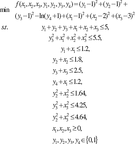 When the vector X contains a subset of μ and ν vectors of continuous real variables and integer variables, respectively, |μ| + |ν| = |x| = D, the NLP problem becomes a mixed-integer nonlinear programming problem (MINLP).