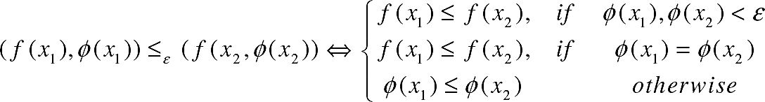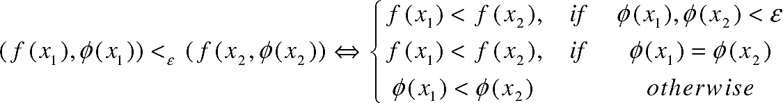 An order relation on the set (f (x), φ(x)) is known as an Ԑ level comparison and defined by a lexicographic order in which φ(x) precedes f(x), favoring the feasibility of x over the minimization of f(x). The comparisons are made according to the rules given by equations 11 and 12:
