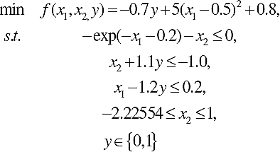 where the global optimum reported in the literature is x=(-1.414214, -1.414214) with f= -2.828427. Two local solutions are at x=(-1,0) with f= -1 and x=(1,0) with f=1. Thus, the solution is required to be in the region bounded by all the constraints. Figure 5 shows how this problem is solved by applying the proposed approach.