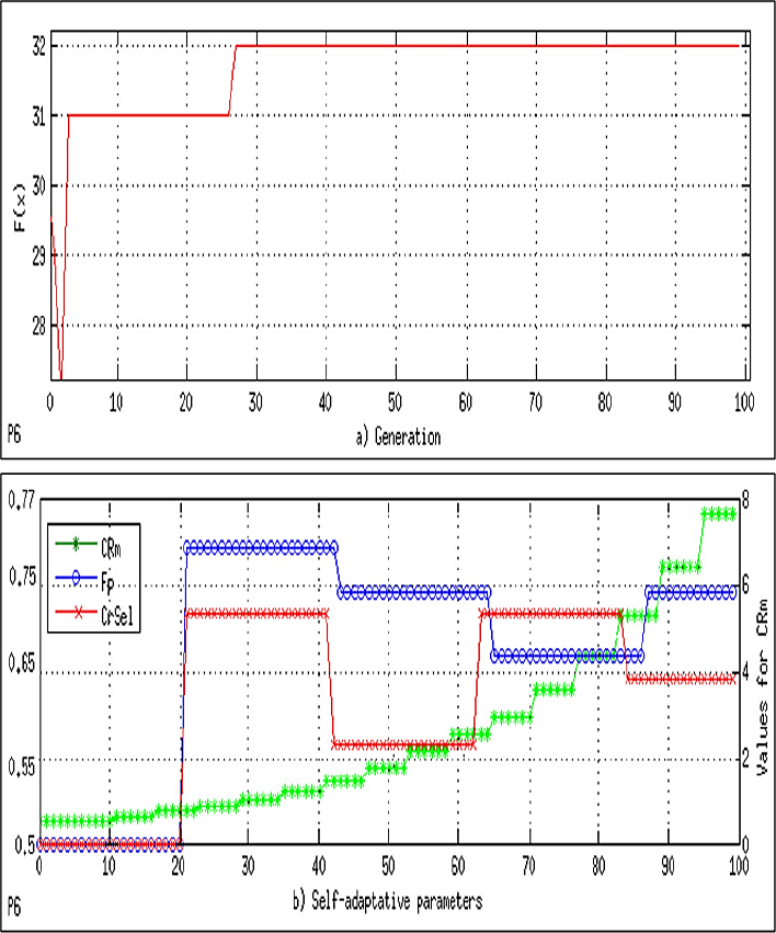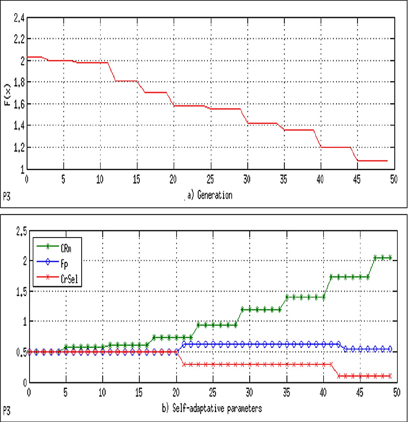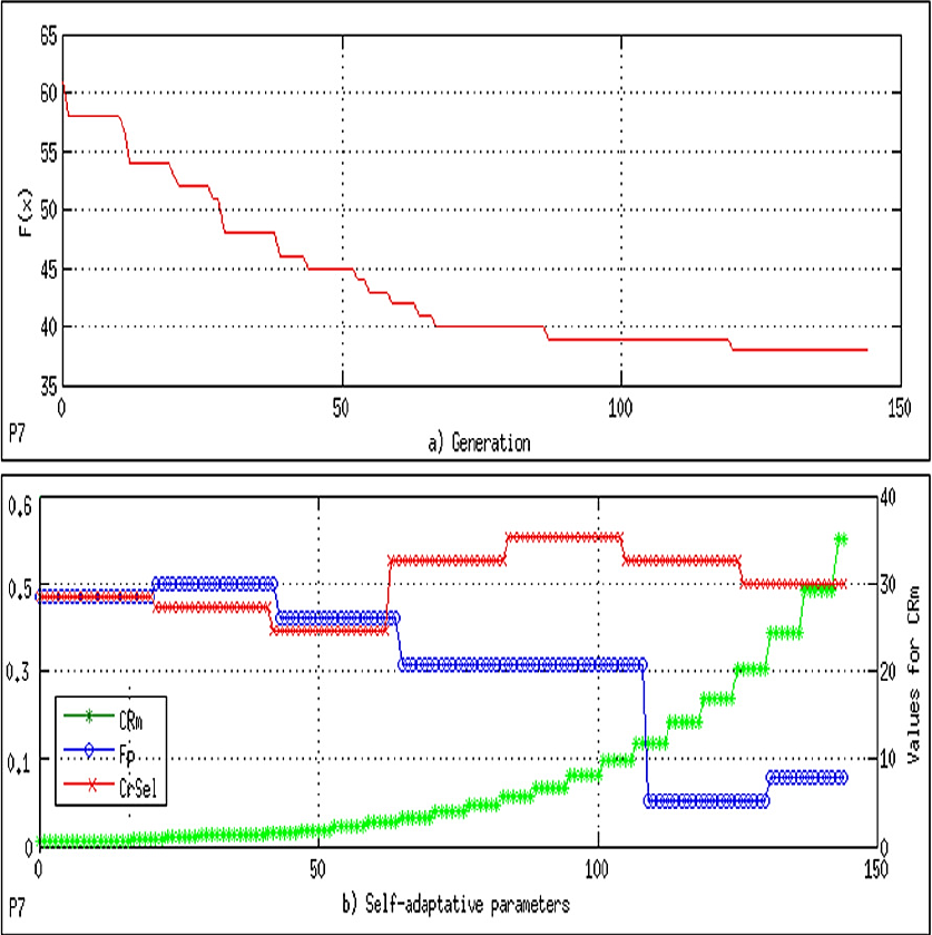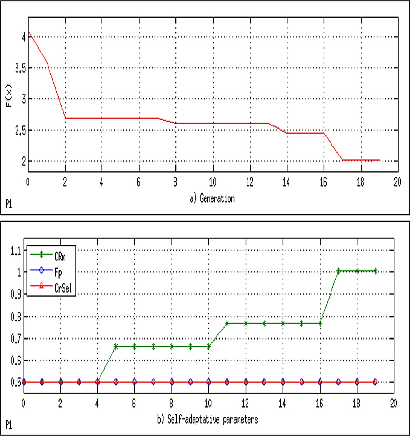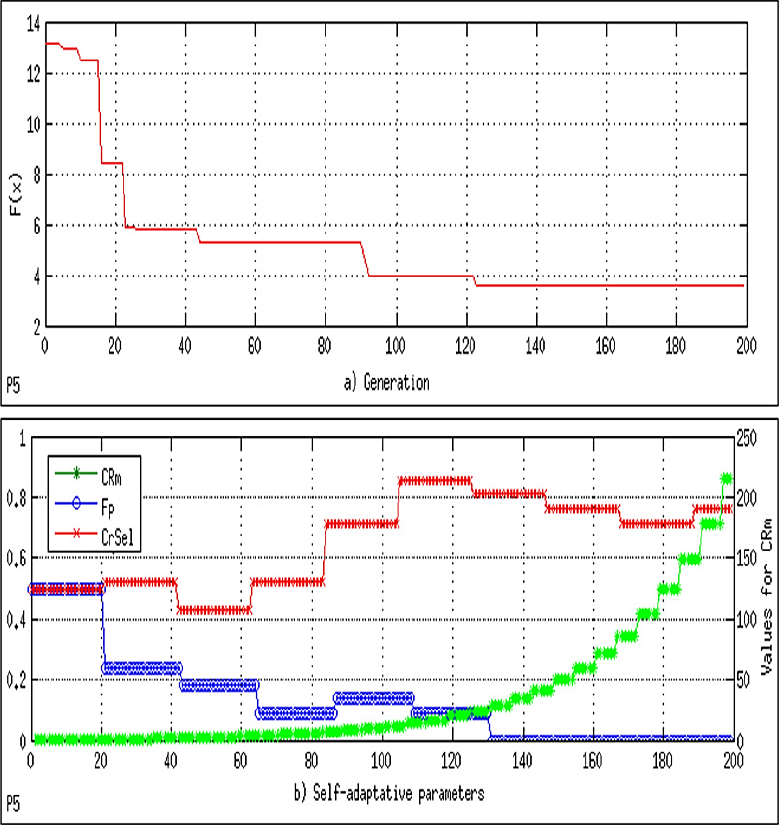 In order to have sufficient data and show their behavior, the parameters used are the population size Np = 200 and the maximum number of generations MaxGen=50; each of the self-adaptive variables, namely, CRsel, fp, and CRm, starts with a value of 0.5. After 20, 20, and 5 generations, respectively, the variables are updated ("learning period"). The algorithm was able to find the global optimum in 0.018 s, with 10200 evaluations of the objective function.