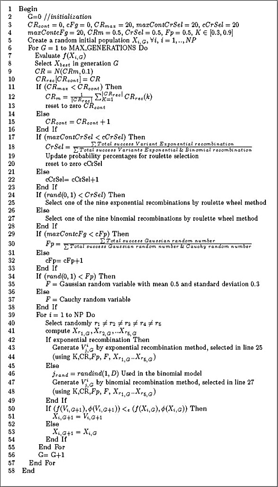 The impact of the various DE search operators on the exploration/exploitation of the search space is not the same. Certain mutation operators are more oriented toward exploitation, e.g., DE/best/1, whereas others are more oriented toward exploration, e.g., DE/rand/1 13. Thus, it can be difficult to choose the most efficient mutation operator, and a problem-dependent parameter may affect the performance of the algorithm. A determined combination of DE parameters can be suitable for one problem but unsuitable for another 44. In order to raise the level of generality, our approach incorporates in the hyper-heuristic framework a selection method for choosing the type of recombination to be applied for generating the next population, either exponential or binomial, by a random process. The method includes a variable, CrSel, which is set to 0.5 initially; after a determined number of generations, CrSel will be self-adapted according to equation 7 (see Figure 3: lines 17 to 23).