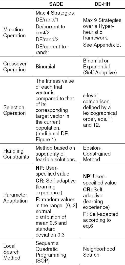 In 43, a hyper-heuristic based on DE was proposed. The approach consists of two phases. The first phase is responsible for selecting the type of recombination to be adopted (either bin or exp). At the beginning of the search process, a training stage based on the maximum number of generations and a random descent selection mechanism is required to initialize the expected values for each of the DE variants. The second phase is responsible for selecting the specific model to be applied for generating the next generation. Random selection and roulette wheel selection mechanisms are used. Stochastic ranking is incorporated for handling the constraints. Twelve crossover model strategies are used as low-level heuristics in the hyper-heuristic framework.