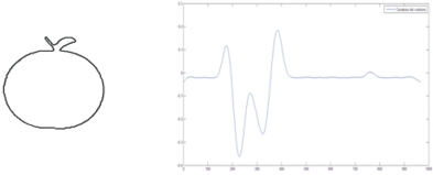 La curvatura es un concepto extremadamente importante porque expresa la naturaleza local geométrica de la curva. Por ejemplo un valor de cero para la curvatura corresponde a una línea recta, por otro lado si el valor es constante indica un círculo o un arco de círculo. De manera general la curvatura es proporcional a la variación local de la curva. Otro hecho importante de curvatura es que resulta invariante a rotaciones, traslaciones y reflexiones de la curva original. En este paso se extrae el contorno y se calcula la curvatura siguiendo la ecuación 1 del contorno mediante una proporción entre área interior al objeto y el área total en una vecindad circular para cada punto del contorno. En la figura 2 se muestra el gráfico de la curvatura para un objeto manzana.