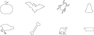 Para la evaluación se utilizaron dos bases de datos de imágenes. La primera colección de objetos se creó de manera artificial y consistió en objetos geométricos básicos, dígase cuadrados, círculos y triángulos. Como segunda colección se empleó la base de datos de imágenes MPEG-7 Core Experiment CE-Shape-1 [9]. Esta cuenta con 70 clases, con 20 objetos por clase rotados y escalados. En la figura 6 se muestran algunos ejemplos de las clases.