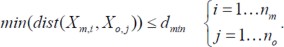 De forma análoga al método de la sección 2b, la asociación de B-splines considerará inicialmente solo los puntos del polígono de control que genera las curvas. En este paso, las distancias entre los puntos de los polígonos de control de todos los objetos son obtenidas asociando las curvas observadas en la posición k+s, con las curvas de referencia almacenadas en el mapa, usando el criterio mostrado en la ecuación 3. Donde XO,i y XRSL,I son los puntos de control de las splines observadas y de las splines en el mapa que se está construyendo respectivamente, dist (XRSL,i, XO,i) representa la distancia Euclidiana entre dos puntos. Finalmente nm y n0 son el número de puntos de control de las spline en el mapa y de las spline observadas en la posición k+s respectivamente. Al final de esta primera etapa, las splies con un número mínimo μmin de puntos de control relacionados, serán asociados.