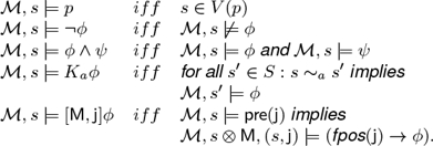 = ⟨S, ~a, V⟩ and a rooted action model (M, j) with M = ⟨S, ~, pre, pos⟩, the notion of satisfaction