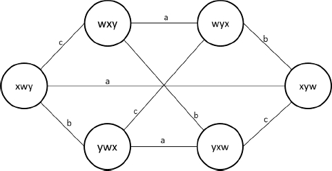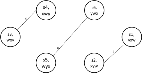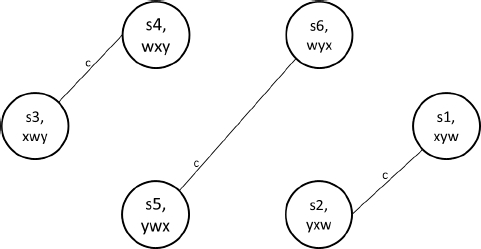 Suppose a card game with three cards x, y and w, and three players a, b and c. Initially, each player receives a card and does not know the card of the other players. We use a positional notation where x, y, w means that player a has the card x, b has the card y and c has the card w. Edges labeled with the agent name means that the agent does not distinguish the bound states from the edge. Initially, we have this epistemic model: