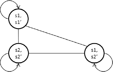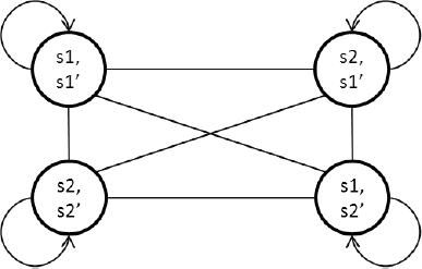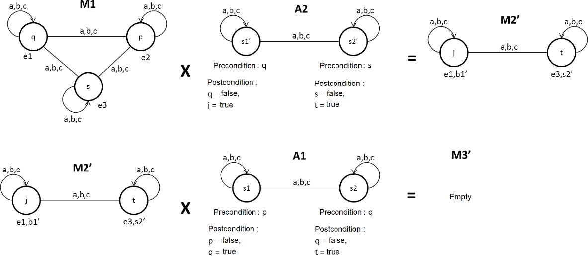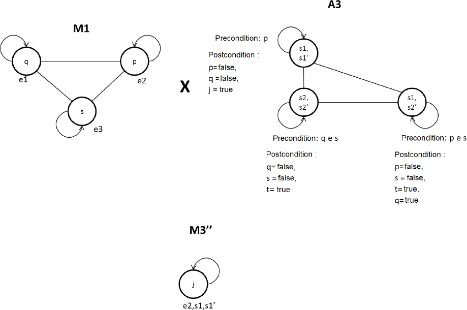 Now, in each resulting state (action), we verify whether the postconditions of the action of model A1 are compatible with the preconditions of the action of model A2. If they are not compatible, we will delete the state. With this, the state (s2, s1’) has been eliminated, resulting in the model of the Fig.10.
