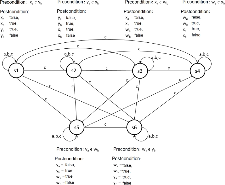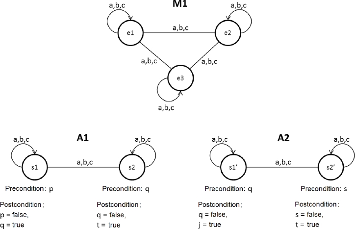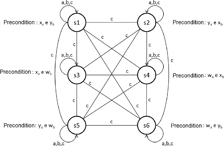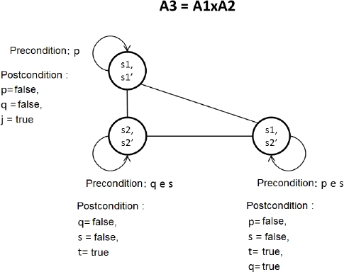 The precondition of the action model resulting from the composition of the two action models has to contemplate the needs of the two action models, so a naive idea would be to merge the preconditions.As the postcondition changes the values of the propositions, we have to take them in consideration. For example, if q = true is postcondition of s1 and q is precondition of s1’, q does not have to be in the preconditions of state (s1, s1’), because it will always be true. Thus, the precondition of the new state is formed by the merge of the precondition of the model A1 with the precondition of the model A2, excluding the true propositions in the postcondition A1.