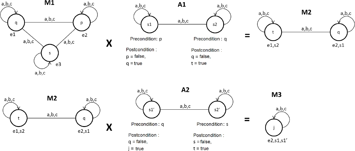 Suppose that we apply the action A1 in the model M1, generating the model M2, and then we apply the action A2 in the model M2, generating the model M3. This sequence can be seen in the figure below: