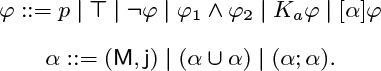 Definition 1 The language of the action model with assignments consists of a finite set Φ (p1, p2, ..., pn) of propositional symbols, a finite set 𝒜 of agents, the boolean connectives ¬ and ∧, the operator Ka for each agent a, and the operator [M, j]. The formulas are defined as follows: