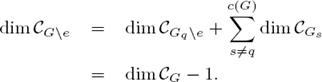 q for some q; thus dim 𝒞Gq\e = |EGq\e| − |VGq\e| + 1, but |EGq\e| = |EGq| − 1 and |VGq\e| = |VGq| so we have that dim 𝒞Gq\e = dim 𝒞Gq − 1. On the other hand, since G = ⊕sGs we have that G\e = [Gq\e] ⊕ ⊕s≠q Gs and so a sum of cycle spaces 𝒞G\e = 𝒞Gq\e ⊕ ⊕s≠q 𝒞Gs such that