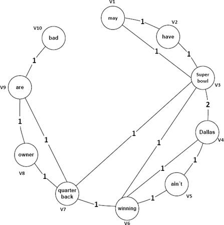 As an example of this graph, consider the following sentence ζ extracted from a text T : “They may have a SuperBowl in Dallas, but Dallas ain’t winning a SuperBowl. Not with that quarterback and owner, they are really bad.”, which after a preprocessing stage10 would be as follows: “may have SuperBowl Dallas Dallas ain’t winning SuperBowl quarterback owner are bad”. Based on the proposed representation, preprocessed sentence ζ can be mapped to the co-ocurrence graph shown in Figure 3.