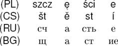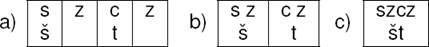 In order to evaluate how good a given set of correspondence rules is, we should evaluate how well these rules describe the data. However, this is not entirely unproblematic. For example, if we are given the Polish-Czech correspondences (s,š), (sz, š), (c,t), (cz,t), and (szcz,št), then we can segment the sub-strings szcz and št e.g. as shown below.