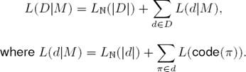 Here, D is the data at hand, M the explaining model, and M the model class we draw our models from. L(M) is the length, in bits1, of the description of model M.