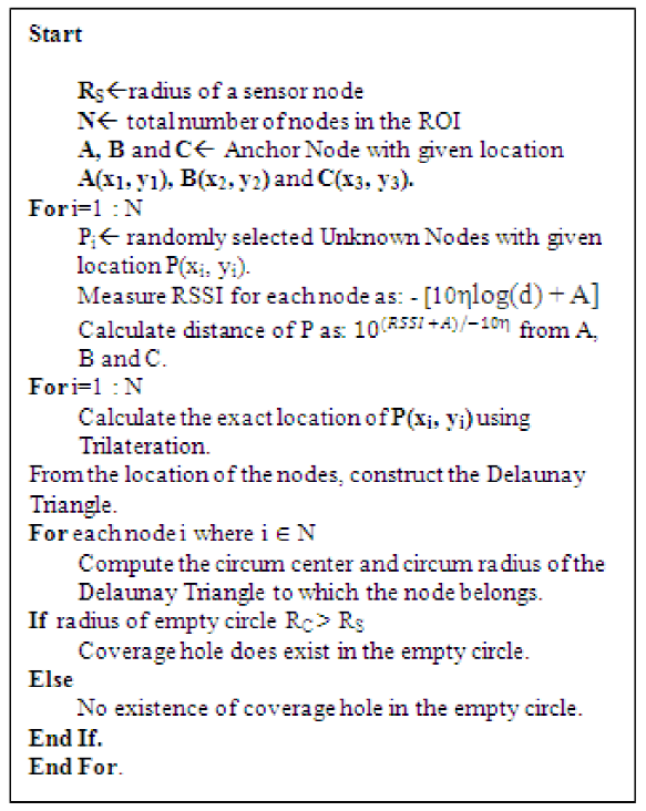 From the above discussions, it is very much clear that graph-based computational geometry approaches are very promising for coverage hole-detection. Also, distributed algorithms for coverage hole-detection is much fruitful. Further, we had the observation that node location information is the most important prerequisites for coverage hole-detection algorithm. And for this, RSSI based distance estimation and Trilateration based position estimation is very efficient.