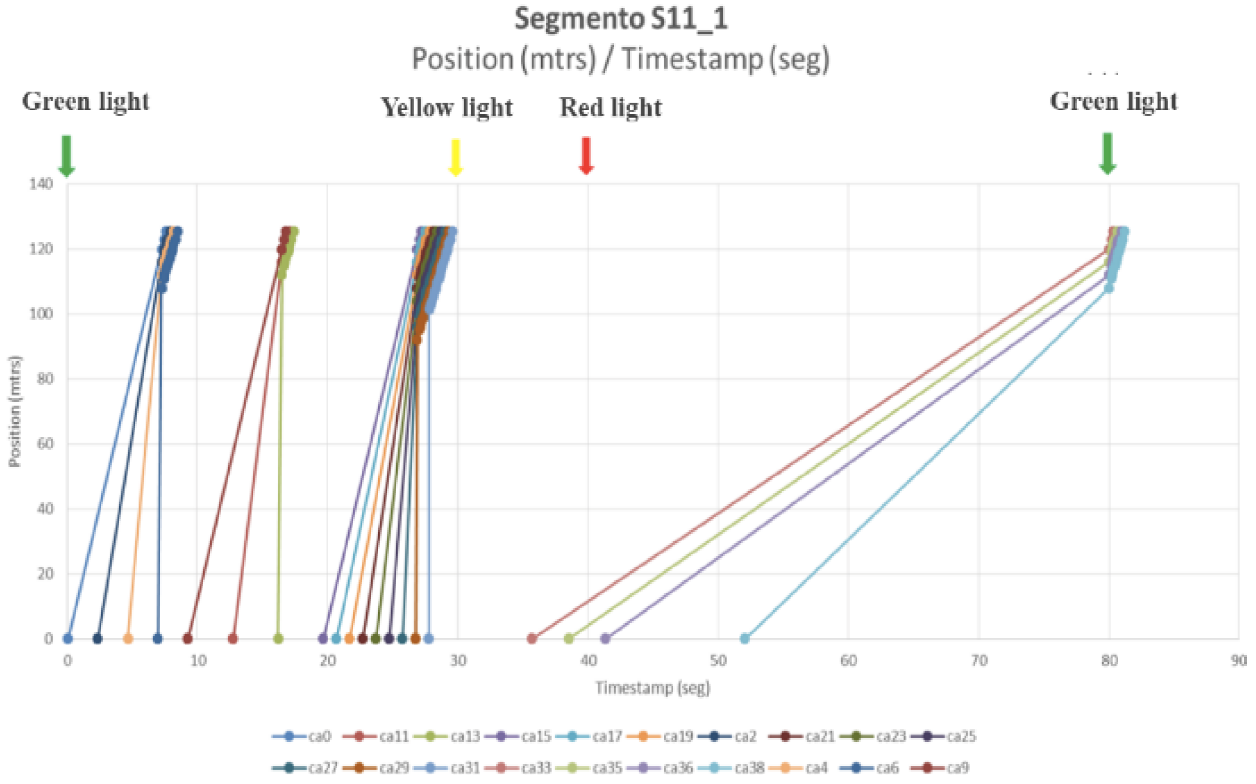 On the other hand, Fig. 11 shows the displacement of vehicular traffic by integrating the speed control (SpeCo), where a change in the behavior of the vehicles can be observed; reflecting a variation in the speed of each vehicle in the inclination corresponding to the displacement, avoiding entering a stopped state when the traffic light is red.