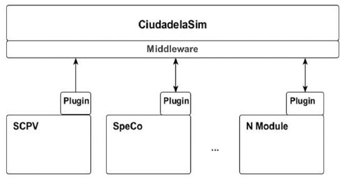 The Fig.4 shows a general block integration diagram, where the development of middleware was necessary and whose function is to integrate SCPV and SpeCo components to the traffic simulator CiudadelaSIM through the middleware. In addition, modularity is allowed for the integration of n components, through the middleware and a plugin connection. CiudadelaSIM is the main component of ITSiE, all components are connected through a middleware. Where a JSON-type data is sent for each execution of an event with a set of parameters associated with the event and SpeCo responds with a JSON-type data with a new event based on the analysis of the sent parameters.