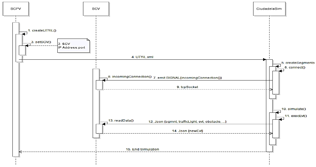 Once the modification of the UTYiL file has been described, SCPV sends the simulation proposal to CiudadelaSIM; CiudadelaSIM receives and interprets the configurations described in the file. The connection between CiudadelaSIM and SpeCo is carried out through a web service through sockets with the communication of the TCP / IP protocol.