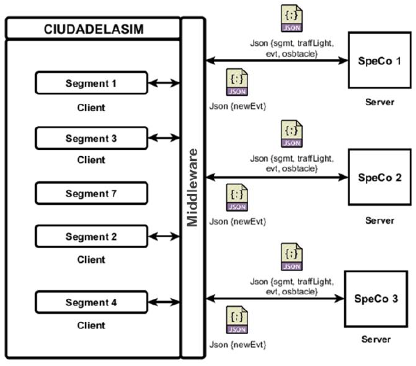 Fig.6 shows the ability of SpeCo to host multiple clients in a parallel way having control of one or more segments within CiudadelaSIM, this makes CiudadelaSIM a multi-client that simultaneously connects with multiple servers.