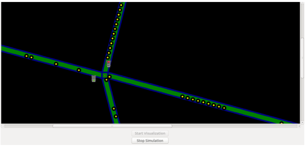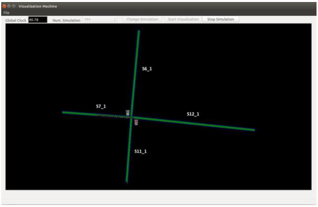 The visualization machine has the function of visually representing the simulation performed. The process begins with the reading of the UTYiL file for the construction of the road infrastructure; the segments and intersections and the objects within the road infrastructure are drawn. Subsequently, a connection to the PostgreSQL database is established and a query is made to obtain all the events executed within the simulation of the simulation machine, and finally, they are ordered based on the execution time. Visual simulation is obtained, which shows the displacement of the vehicles and the change of light at the traffic lights throughout the simulation period, always governed by a global clock.