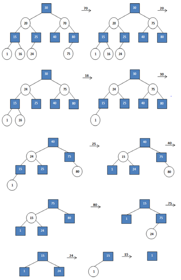 Delete (40): 40 is replaced by 75(its in-order successor). 75 is removed from class 80. 80 becomes the new root.