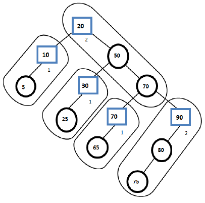 Insert (75): This case is represented by two trees (75a and 75b). a) 75 is inserted into class 70 and augments its height. Class 70 is balanced in the sense of an AVL tree but it overflows. It is then partitioned to generate two other classes: 35 and 85. b) Node 70 becomes a new leaf of class 20 and then overflows (class surrounded in red lines). As class 20 has one child, it is structured (left rotation of node 20). 30 becomes the new root.