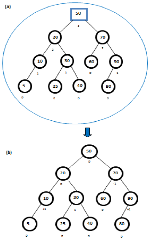 Figure 3(a) shows the new structure as a structure equivalent to an AVL tree. There is only one class containing an AVL tree. Values under the nodes designate the height of the nodes.