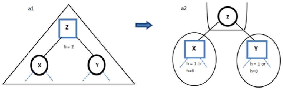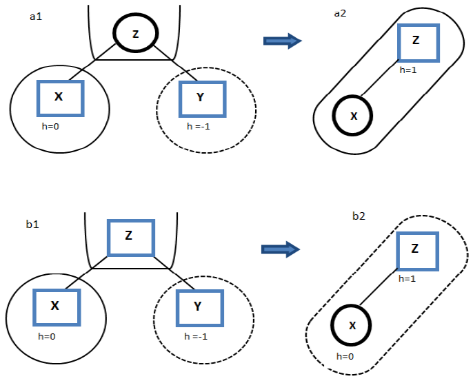 In Figures 6(a1) and 6(b1), after a delete operation, the height of class Y becomes -1 while its direct sister class has a height equal to 0. A Departitioning operation holds. Node Z is deleted from the mother class as depicted in Figures 6(a2) and 6(b2). Figure 6(b2) shows a situation where the conflict is not yet resolved. This means that the process continues since the mother class has no child. Two nodes' kinds will be modified: the parent node and its child. The parent node becomes a class node while its child becomes a simple node.