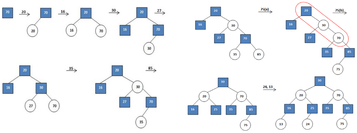 Insert (27): 27 is inserted to the left of node 30 and this causes a restructuring (right rotation of node 70).