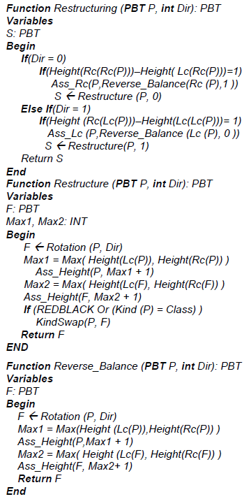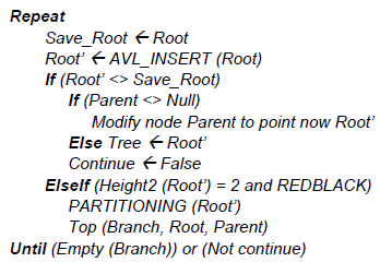 In the insertion process an element is always added into a leaf class. In AVL tree case (Parameter REDBLACK = False), the process terminates. In Red-Black tree case (Parameter REDBLACK = True), if the height of this class becomes 2, the algorithm described below is applied. It uses a stack containing all the nodes traversed from the root (Tree) of the entire tree until the parent of the newly inserted node. The algorithm goes upward the tree from the inserted node towards the root of the tree by making either Restructuring or Partitioning. When Restructuring is performed, the process terminates. On the other hand, Partitioning can be in cascade.