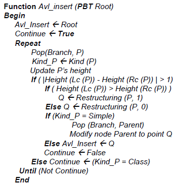The insertion algorithm begins with the root of the overflow class (Root) and its parent node (Parent). The parent is used to update links when a restructuring is performed. Top operation gives the root of the mother class and its parent node without popping elements from stack Branch. Recall that function AVL_INSERT(Root) adjusts the balance of the class rooted at Root and returns the new root of the class.