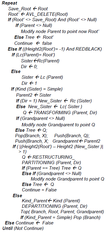 If the root of the class is modified by the AVL_DELETE function, one or two restructurings are done and then test "(Roof < > Save_Root) And (Roof < > Null)" holds. Flag Continue is set to False. As a consequence, only one iteration of the Repeat loop is performed. If the root of the class is not modified, test "Height2 (Roof) = -1 and REDBLACK" fails since RED_BLACK is false. Furthermore, the stack is empty as there is no restructuring in AVL_DELETE.