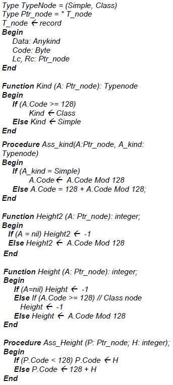 The new structure uses one additional byte in every node. Bit 1 is set to 1 if the node is a class node. Otherwise this bit is set to 0. Bits 2 to 8 hold node height. In this way, Height(Code) is simply Code Mod 128. Moreover, if Code ≥ 128 then it is a class node. Otherwise, it is a simple node.